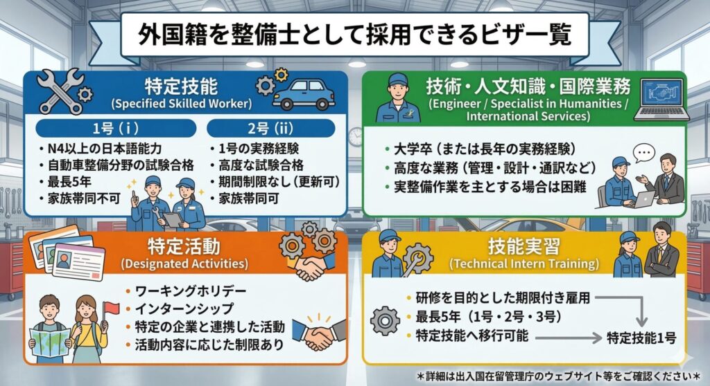 つまり、自動車整備士 外国人の採用は「外国人だから同じ」ではなく、在留資格ごとに採用条件が違うという理解が重要です。