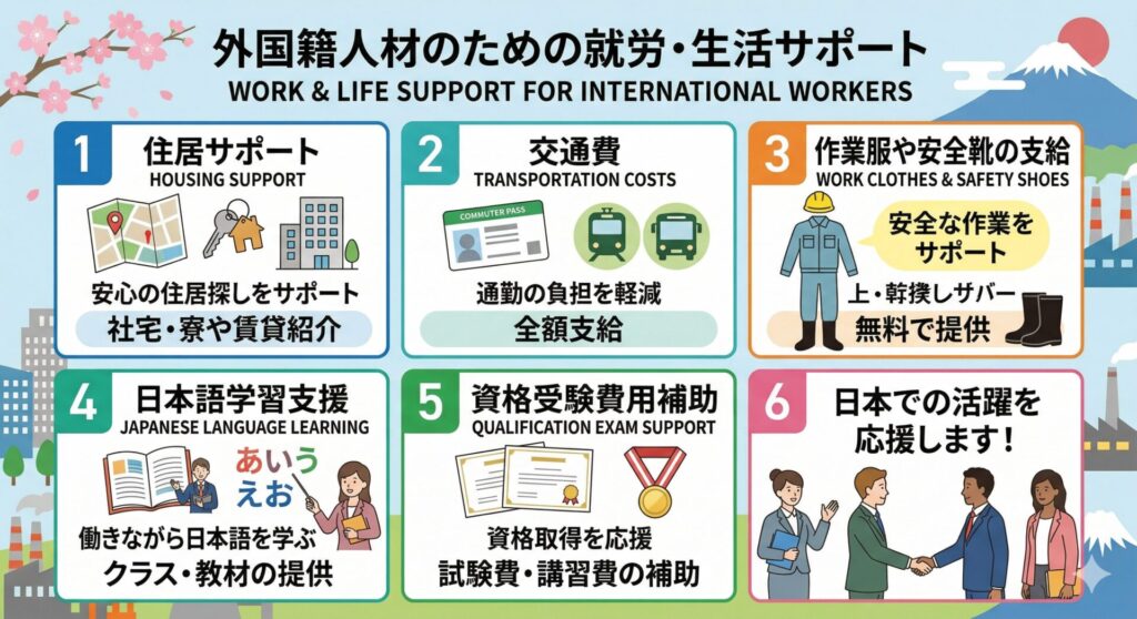 「資格取得支援あり」「先輩がOJTで教える」「マニュアルあり」「写真付き手順書あり」といった情報は、外国籍人材にとって非常に安心材料になります。